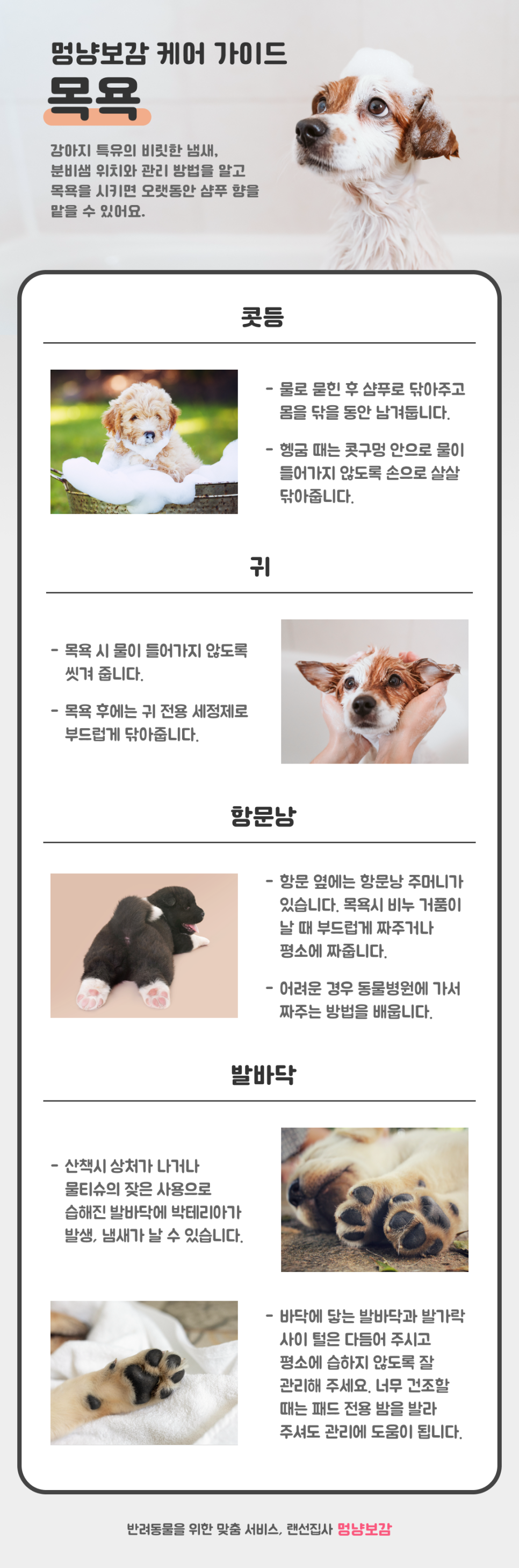 강아지의 피부가 약할 경우 잦은 목욕보다 부분 적으로 닦아 주시면 좋습니다.